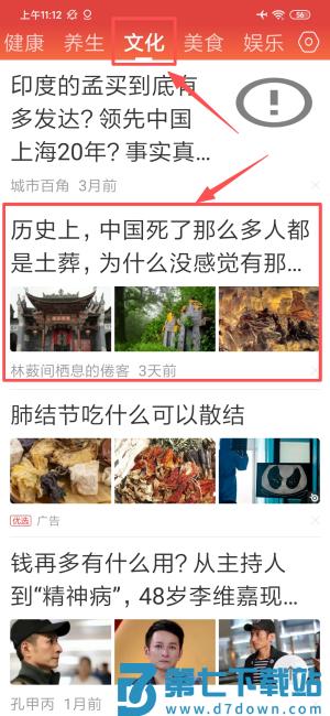 2、于文化分类选取历史类文章,进入内容浏览页面。