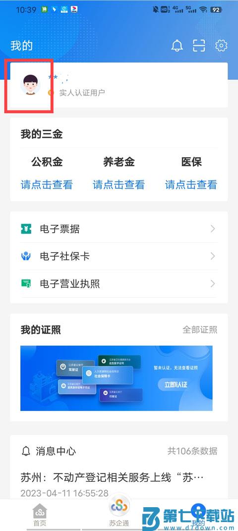 在本页面下载安装苏服办app至手机端。点击软件进入首页,在我的页面中,点击头像,进入个人信息界面,如图所示。