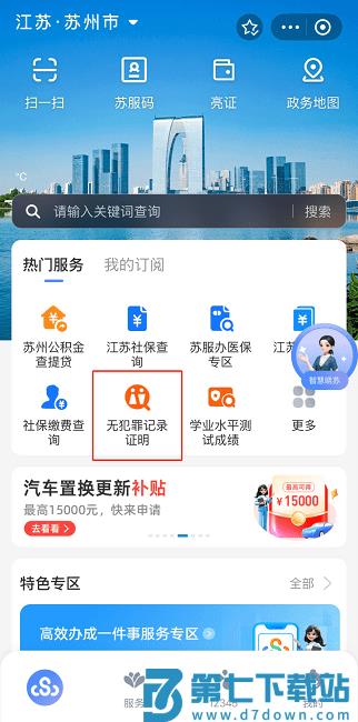 登录苏服办app之后,在首页搜索“无犯罪记录证明”进入服务;
