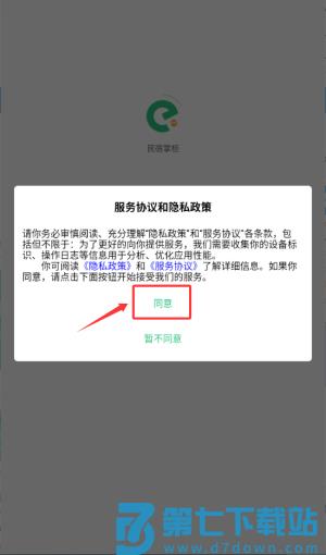 1、启动民宿掌柜应用,在协议政策页面点击同意以继续使用。
