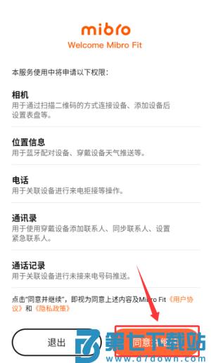 1、在Mibro Fit APP中点击"同意并继续",进入程序界面。
