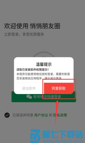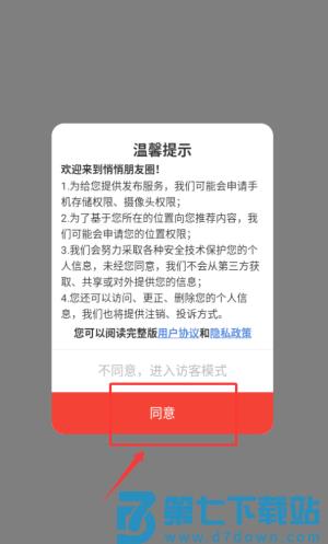 1、在悄悄朋友圈APP中点击"同意"温馨提示,进入程序界面。