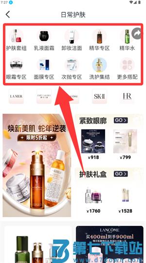 2、接着进入护肤分区,根据面霜、精华等分类筛选所需护肤商品。