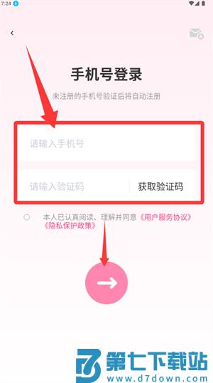 1、首先在登录页面输入手机号,填写验证码后点击箭头登入。