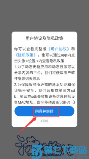 1、在洪泽论坛APP中点击"同意并继续",进入程序界面。