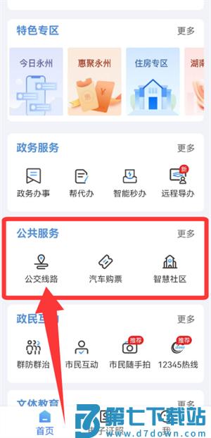 3、返回应用首页,在公共服务分类中查找并进入“公交线路”功能。