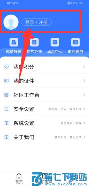 2、接着进入个人中心页,点击“登录注册”区域完成账户注册或登录。