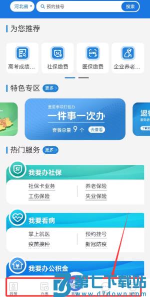 2.首页精简要素,突出服务。为你推荐高频热点门类服务,涵盖社保服务、公积金、纳税缴费、医疗保险、交通出行、便民缴费。点击图标,热门服务应用尽有。