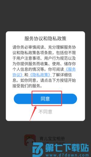 1、在育儿宝宝相册APP中点击"同意"服务协议,进入程序界面。