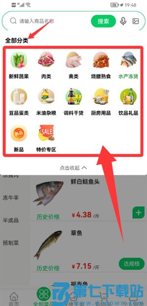 3、返回首页,点击分类入口,浏览蔬菜、肉禽等各类商品并选购。