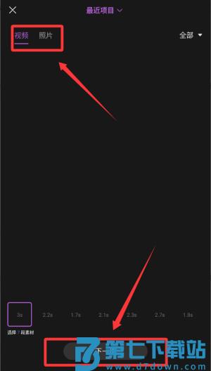 4、左上角可以选择视频或图片一个需要7个素材再点击下一步。