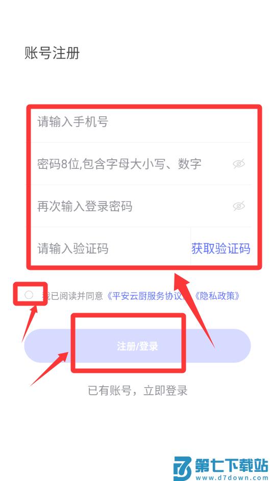 3、输入手机号码和密码,在红色框框里打√并获取验证码然后点击注册。