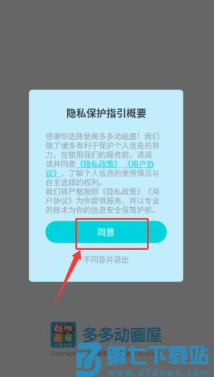 1、在多多动画屋APP中点击"同意"隐私指引,进入程序界面。