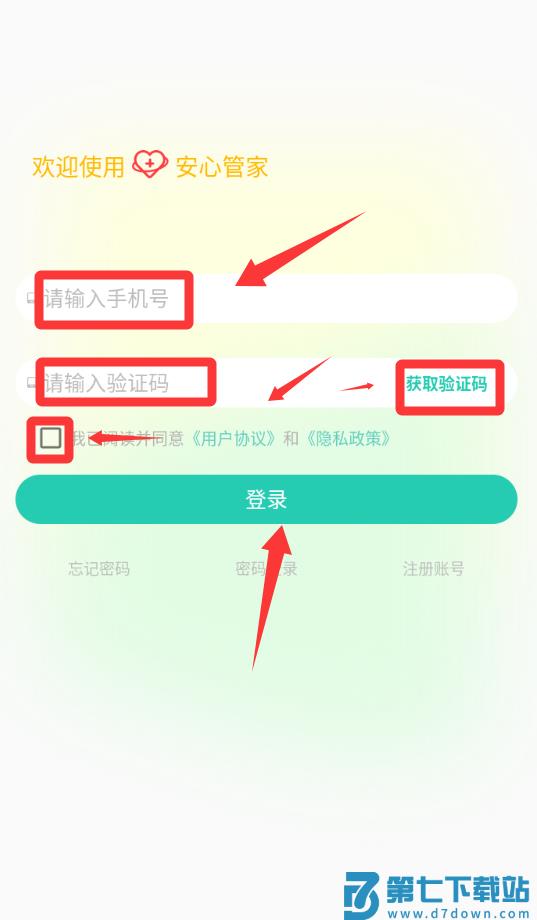 2、输入手机号码获取验证码并打√然后登录。