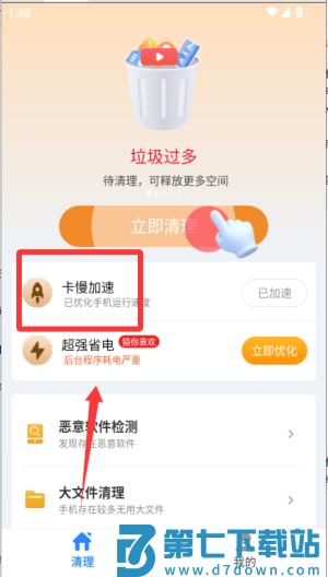 1、打开超神清理App,点击首页“一键加速”按钮,系统会自动关闭后台耗电应用并释放内存。
