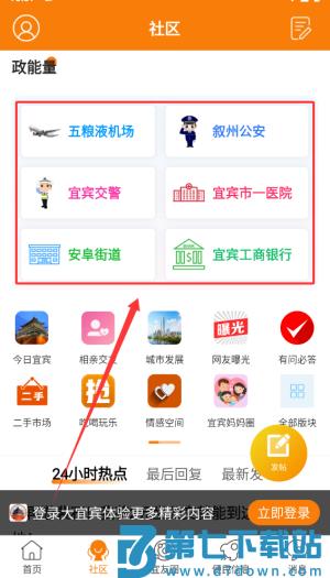 4、社区板块接入五粮液机场、徐州公安等机构账号,提供属地信息服务。