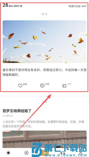 2、浏览首页时你会看到顶部显示日期和虚拟天气,中间滚动着每日金句,轻点数字区域还能查看互动数据。