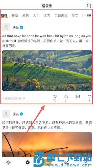3、进入语录集板块后,顶部有精选、励志、人生等分类标签,遇到喜欢的句子只需轻轻一点就能永久保存。