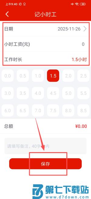 3、于记录页面选择工作时长等相关信息,点击保存按钮完成工时登记。