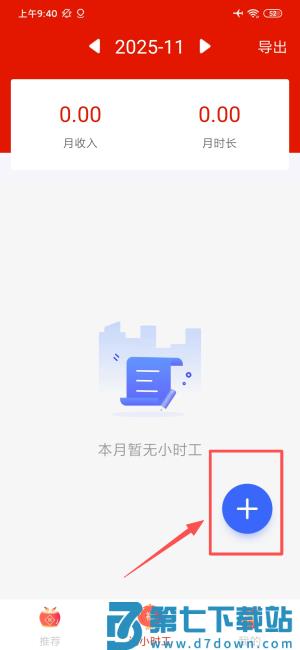 2、成功登录后切换至记小时工界面,点击中央加号按钮新建记录。