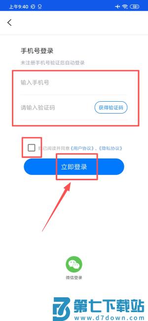 1、在手机号登录页面填写号码及验证码,勾选协议后点击立即登录。