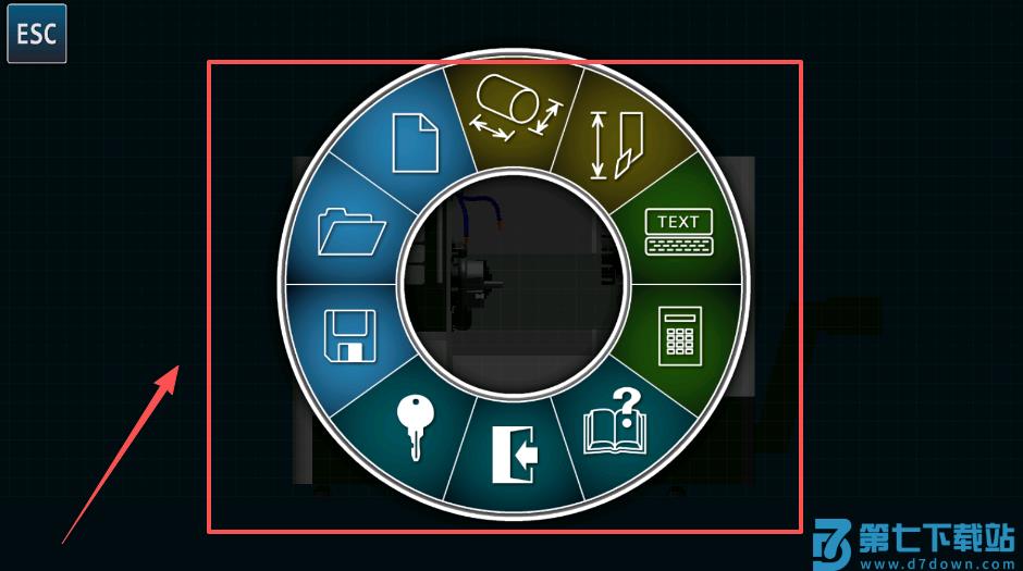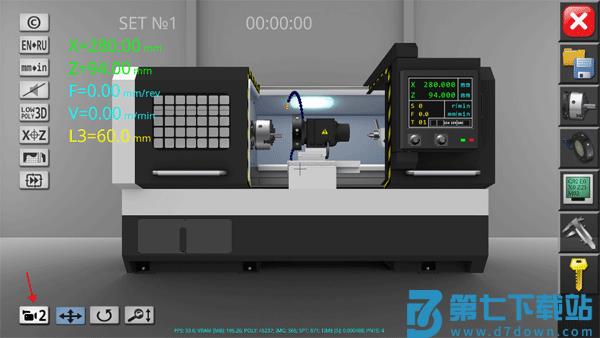 你会看到左边、右边和左下方都有功能选项,点击左下方红色箭头指向的地方,这个是用来切换cnc数控车床仿真模拟器不同的视角,从不同视角来熟悉这款机器。