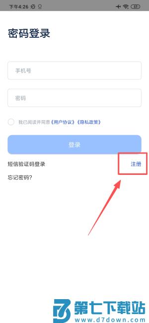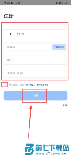 3、完整输入手机号码及验证码,勾选协议框后点击注册按钮完成开户。