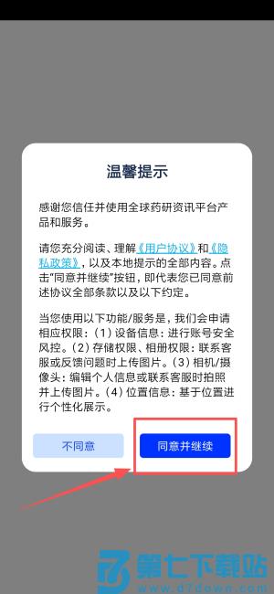1、阅读温馨提示弹窗内容后点击“同意并继续”,进入用户登录界面。