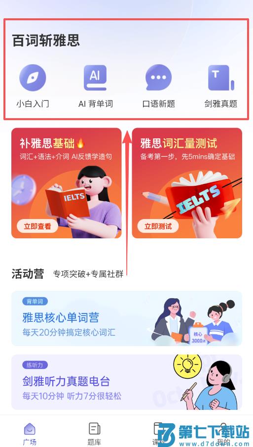 3、在广场页面可以发现很多实用工具,比如剑雅听力真题电台每天十分钟的碎片化练习,还有当季口语题库配合AI实时纠音。