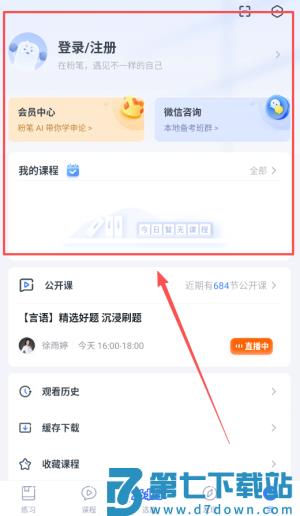1、首先打开粉笔APP完成登录或注册,在首页可以看到会员中心、我的课程和公开课等核心板块。