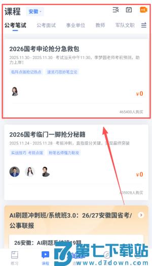 3、在课程页面,你可以按地区筛选内容,就能看到公考笔试相关的课程,例如2026国考申论抢分急救包或临门一脚抢分秘籍。