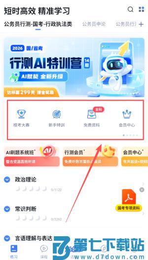 2、进入APP后,如果想短时高效学习,可以关注首页推荐的公务员行测或申论课程,比如行测AI培训营或AI刷题系统班。
