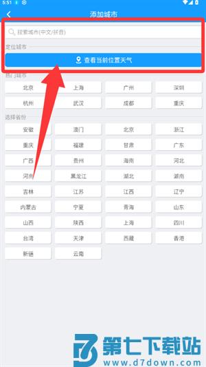 1、进入添加城市页面,点击查看当前位置天气获取信息。