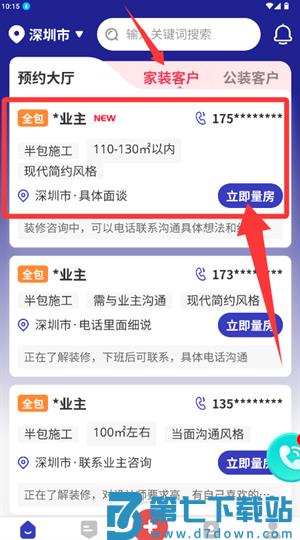 3、在家装页面浏览业主信息,点击立即量房开启服务流程。