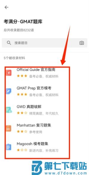 应用内支持GMAT考试中涉及的题型有:Verbal部分的语法(Sentence Correction)、逻辑(Critical Reasoning)、阅读(Reading Comprehension),Quant部分的数据充分性(Data Sufficiency)和问题解答(Problem solving)。涵盖了OG、PREP、GWD、Manhattan、Magoosh等核心材料。