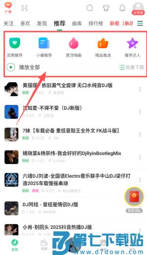 1、打开应用后先完成注册,用手机号或第三方账号快速登录,进入首页后能看到推荐的热门电音歌单。