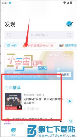 2、在“发现”页浏览每日推荐节目,也可用顶部搜索框输入关键词或RSS地址找播客。