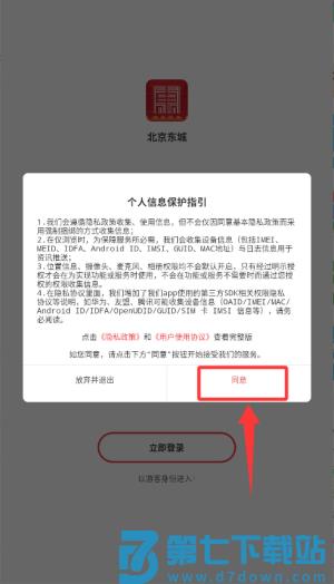 1、在"北京东城"中点击"同意"个人信息指引,进入登录选择界面。