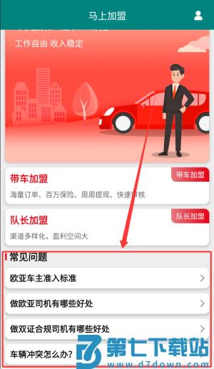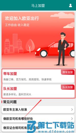 3、主页面清晰展示个人带车加盟与车队队长加盟两种不同形式的合作模式选择入口。