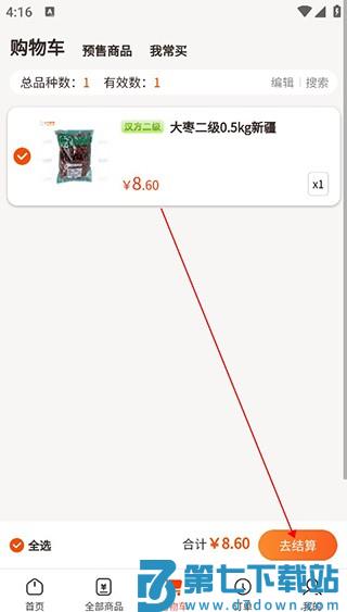 选购完商品之后,就可以进入购物车页面,点击右下角的去结算,提交订单。