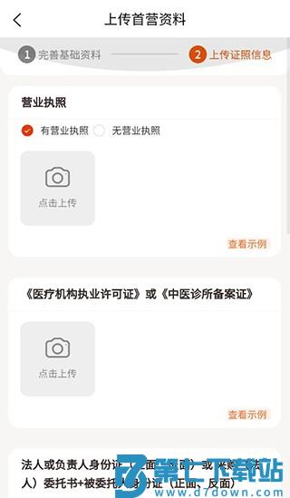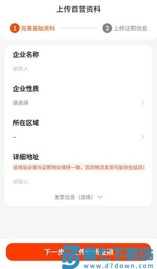 之后需要上传营业资料,输入企业名称、性质、区域等,点击下一步即可。