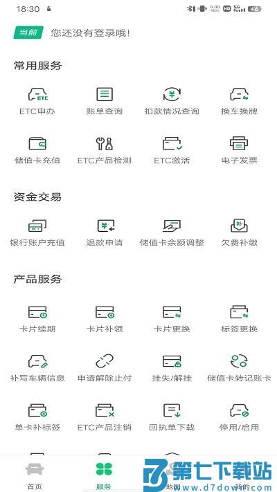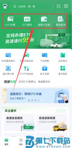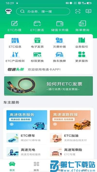 1、首先在本站下载粤通卡app,进入首页后,用户可以看到etc办理,etc激活,储值卡充值,账单查询等功能