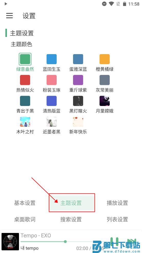 5、在设置界面中,用户可以自定义设置主题、播放、桌面歌词、列表等等参数。