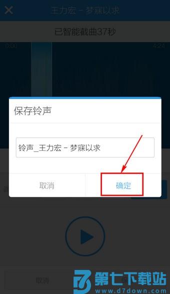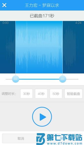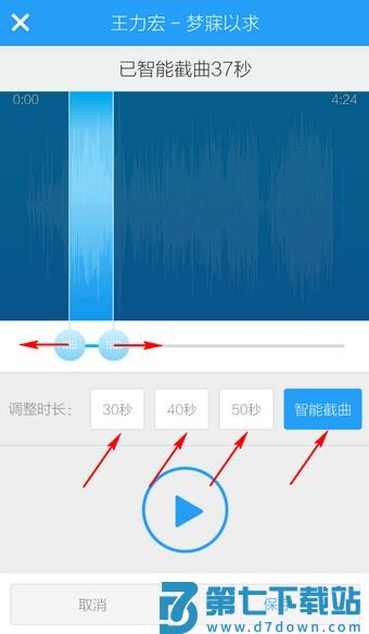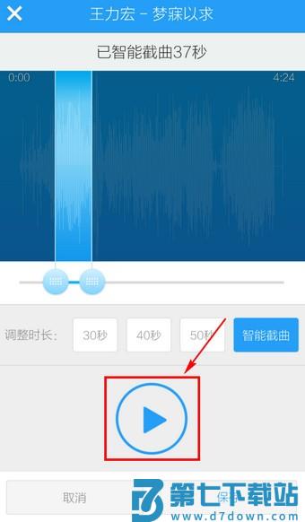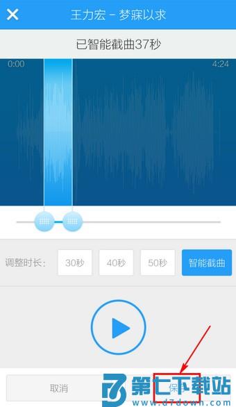 第五步。酷狗音乐app已智能剪切歌曲高潮部分,你可以自己调整,如图所示。