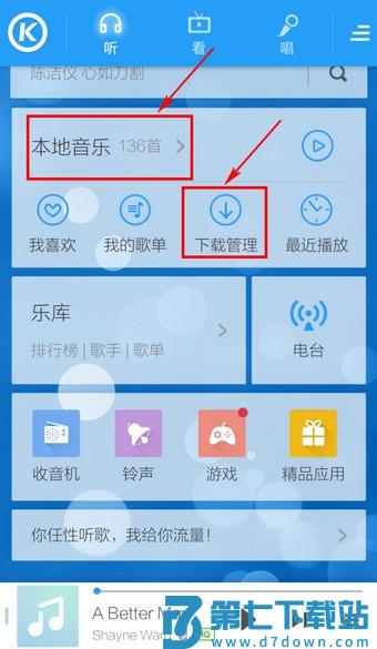首先第一步。在【本地音乐】或【下载管理】找到已下载的歌曲,如图所示。