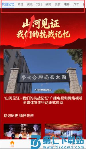 2、首页顶部导航栏提供抗战记忆与美食等多类内容分区。