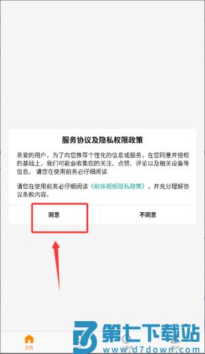 1、启动前排视频应用,先在协议页面点击同意按钮进入程序。