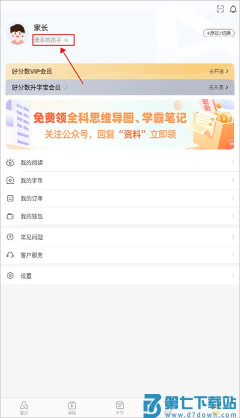 在本页面下载安装app至客户端。点击进入app,我的页面,点击头像下方的“请添加孩子”按钮,如图所示。