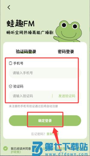1、在蛙趣FM登录页填写手机号及验证码,完成账号登录。