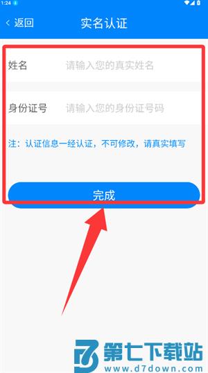 3、输入真实姓名及身份证号码,确认无误后完成认证。